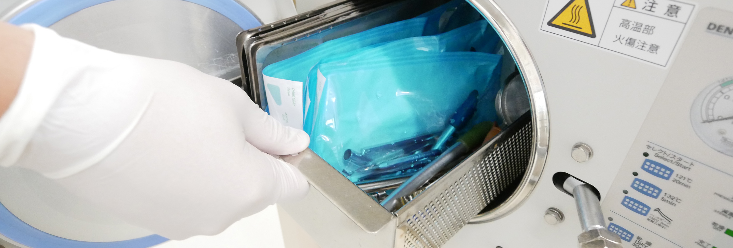 治療に使用する器具はすべて滅菌し、患者さまごとに交換しています。この滅菌器は高圧蒸気であらゆるウイルスや細菌を死滅させることができ、院内感染の予防に役立ちます。